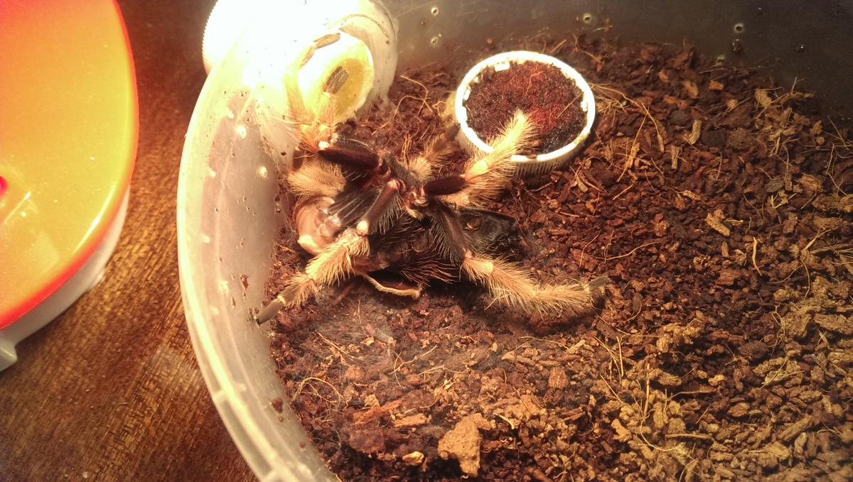 с 03.05.2019 паук перестал питаться. видимо собрался линять. сегодня забрал у него не съеденных тараканов